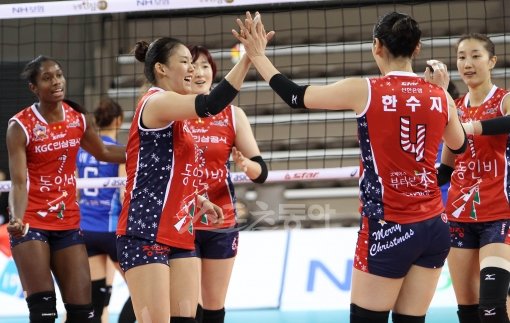 7일 경기도 화성종합스포츠타운 내 배구실내체육관에서 열린 2011-2012 프로배구 여자부 IBK기업은행과 인삼공사의 경기에서 공격에 성공한 인삼공사 선수들이 기뻐하고 있다. 이날 경기는 인삼공사가 3대 0으로 승리했다.