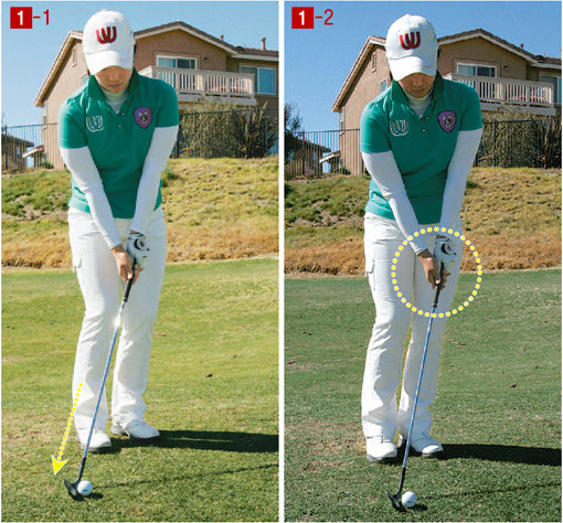 공은 오른발 앞에서부터 바깥쪽에 놓는다(사진1-1). 공의 위치를 오른발 바깥쪽으로 둘수록 더 낮게 굴릴 수 있다. 체중은 왼발에 두고 그립을 잡은 손은 왼쪽 허벅지 앞에 두는 ‘핸드퍼스트’(사진1-2) 자세가 좋다.