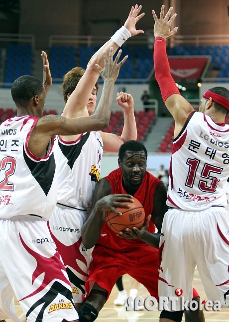 (울산=스포츠코리아) 8일 오후 울산 동천체육관에서 열린 `2011-2012 KB 국민카드 프로농구` 울산 모비스와 창원 LG경기에서 모비스 레더가 LG 수비에 막히고 있다.(윤민호 기자/news@isportskorea.com)