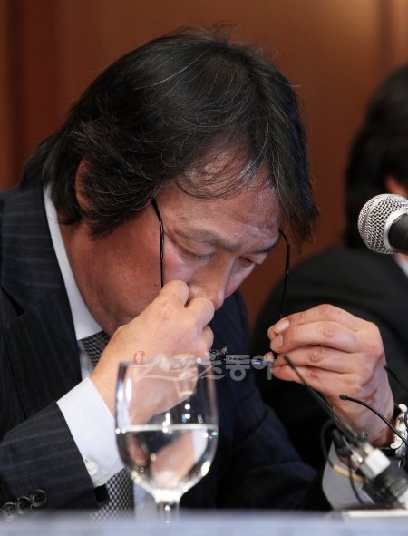 조광래 전 축가대표팀 감독이 7일 전격 경질된 후 9일 오후 서울 강남구 역삼동 노보텔에서 기자회견을 가졌다. 조 전감독이 안경을 착용하고 있다. 조 전 감독은 대표팀의 지휘봉을 맡은 지 1년 5개월 만에 내년 2월 쿠웨이트와의 3차 예선 마지막 경기를 앞두고 7일 밤에 갑작스럽게 결정이 내려져 경질과정을 놓고 파장이 대단하다.
