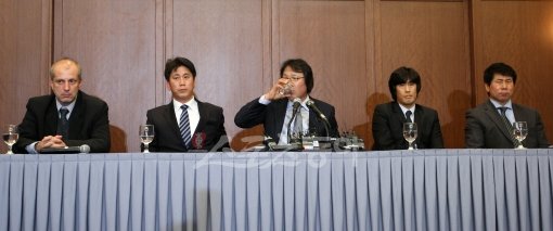 조광래 전 축가대표팀 감독이 7일 전격 경질된 후 9일 오후 서울 강남구 역삼동 노보텔에서 기자회견을 가졌다. 조 전감독이 취재진의 질문에 답하다 물을 들이키고 있다. 조 전 감독은 대표팀의 지휘봉을 맡은 지 1년 5개월 만에 내년 2월 쿠웨이트와의 3차 예선 마지막 경기를 앞두고 7일 밤에 갑작스럽게 결정이 내려져 경질과정을 놓고 파장이 대단하다.