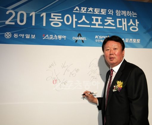 KIA 선동렬 감독이 12일 오전 11시 서울 중구 소공동 롯데호텔 크리스탈볼룸에서 진행된 ‘스포츠토토와 함께 하는 2011 동아스포츠대상’에 참석해 사인을 하고 있다.