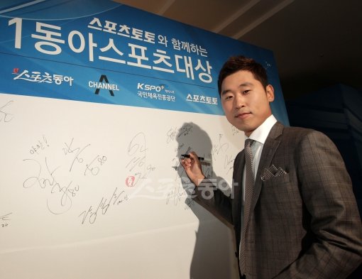 KIA 윤석민이 12일 오전 11시 서울 중구 소공동 롯데호텔 크리스탈볼룸에서 진행된 ‘스포츠토토와 함께 하는 2011 동아스포츠대상’에 참석해 사인을 하고 있다.