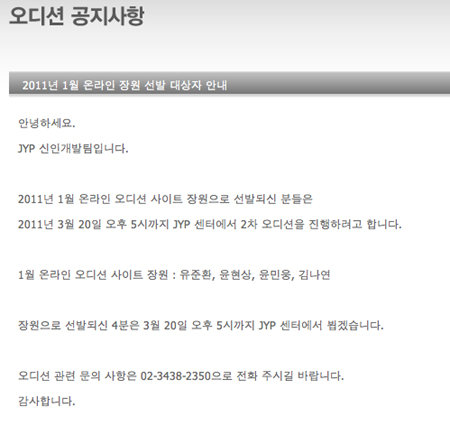 물론 윤 군을 포함, '1월 온라인 오디션'에 통과한 합격자 4명이 모두 JYP소속 연습생이라고 볼 순 없다. 하지만 겨우 4명에 불과한 2차 오디션에 박진영도 참가했을 것이란 추측이다.