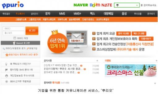 ‘뿌리오(Ppurio, www.ppurio.com)’는 인터넷 사이트 랭킹 조사 기관인 ‘랭키닷컴(www.rankey.com)’에서 SMS 부분 6년 연속 1위를 기록하고 있는 대량 문제 메시지 발송 서비스다. 국내 기업인 다우기술(www.daou.com)에서 서비스를 제공하고 있다. 특히, SKT, KT, LG유플러스 등 3개 이동통신사와 직접 연결되어 전송 품질이 우수하고, 정확하게 전송되는 것이 특징이다. 또한 건당 20원(100건)부터 최대 10.9원(50만 건 사용 시)까지 메시지 발송량에 따라 비용을 절감할 수 있다.