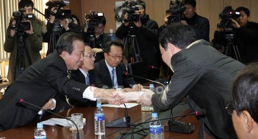 롯데 장병수 대표(왼쪽)와 한화 정승진 대표가 13일 KBO 이사회에 앞서 악수를 하고 있다.