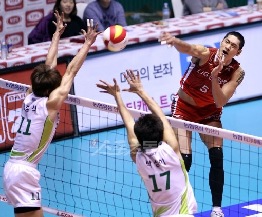 LIG 주포 김요한(오른쪽)이 13일 장충체육관에서 열린 드림식스와 경기에서 최홍석(왼쪽)과 박상하가 버티는 블로킹을 향해 스파이크를 날리고 있다. 박화용 기자 | inphoto@donga.com 트위터 @seven7sola