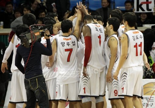 15일 서울 잠실학생체육관에서 열린 2011-2012 프로농구 서울 SK와 부산 KT의 경기에서 KT가 78대 74로 승리했다. 경기가 끝난 후 KT 선수들이 기쁨을 나누고 있다.