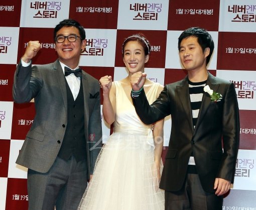 19일 오전 서울 정동 이화여고 100주년 기념관에서 진행된 영화 '네버엔딩스토리' 제작발표회에서 엄태웅,정여원이 정용주 감독과 화이팅을 하며 포토타임을 갖고 있다.