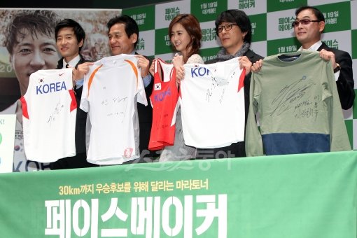 20일 오전 11시 서울 롯데시네마 건대입구에서 영화 ‘페이스메이커’ 제작보고회가 열린 가운데 출연 배우들, 감독, 이봉주 선수가 육상 꿈나무들을 위한 지원을 위해 영화 촬영 때 착용했던 유니폼에 사인을 한 후 들어보이고 있다.