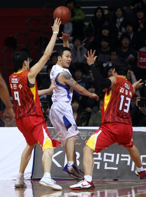 20일 오후 고양체육관에서 열린 2011 ~ 2012 프로농구 서울삼성과 고양오리온스의 경기에서 삼성 김승현이 오리온스 최진수와 김동욱의 마크를 피해 패스를 하고 있다.