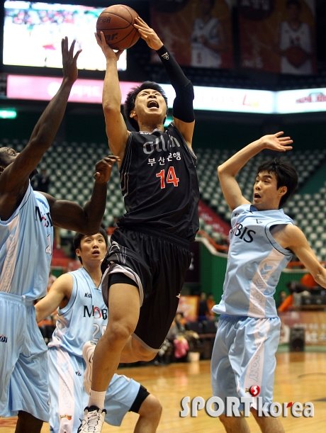 `2011-2012 KB 국민카드 프로농구` 부산 KT 소닉붐과 울산 모비스 피버스의 경기가 21일 오후 부산 사직 실내체육관에서 열렸다. 1쿼터 KT 박상오가 모비스 레더와 이지원의 수비를 뚫고 슛을 던지고 있다.