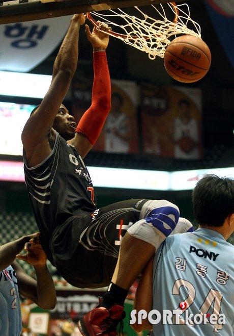 `2011-2012 KB 국민카드 프로농구` 부산 KT 소닉붐과 울산 모비스 피버스의 경기가 21일 오후 부산 사직 실내체육관에서 열렸다. 1쿼터 KT 로드가 모비스 김동량을 앞에 두고 덩크를 성공시키고 있다.