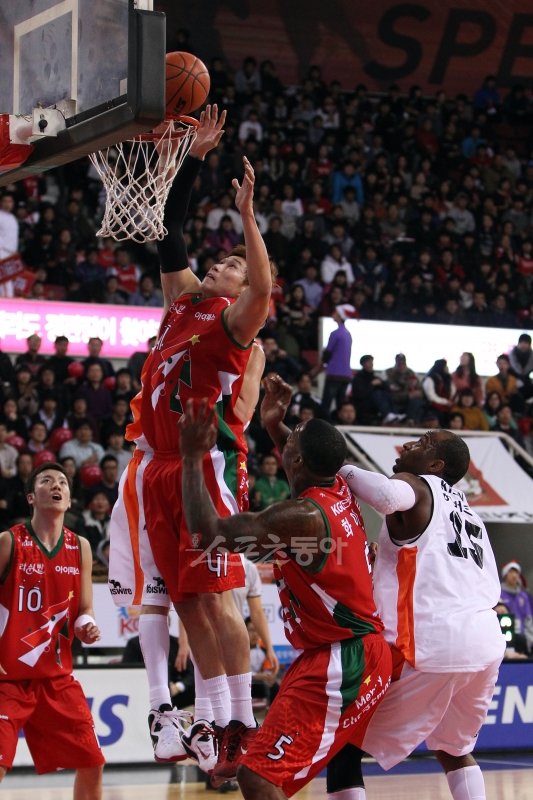 21일 안양실내체육관에서 열린 2011-2012 프로농구 안양 KGC 인삼공사와 인천 전자랜드의 경기에서 인삼공사 오세근이 리바운드하기 위해 높이 뛰어오르고 있다.