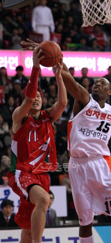 21일 안양실내체육관에서 열린 2011-2012 프로농구 안양 KGC 인삼공사와 인천 전자랜드의 경기에서 인삼공사 양희종이 전자랜드 허버트 힐의 수비를 피해 슛을 시도하고 있다.