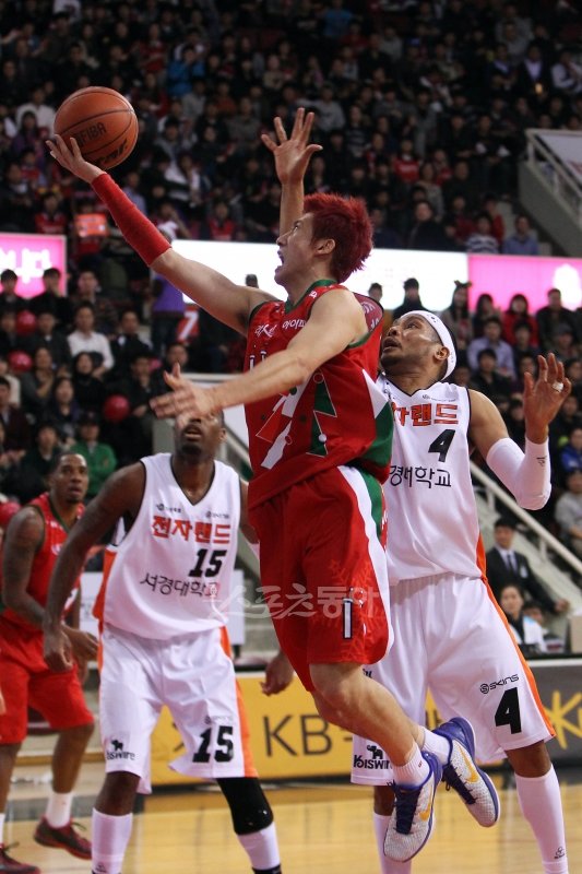 21일 안양실내체육관에서 열린 2011-2012 프로농구 안양 KGC 인삼공사와 인천 전자랜드의 경기에서 인삼공사 양희종이 전자랜드 문태종의 수비를 따돌리고 슛을 시도하고 있다.