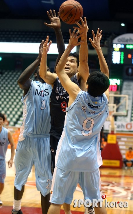 `2011-2012 KB 국민카드 프로농구` 부산 KT 소닉붐과 울산 모비스 피버스의 경기가 21일 오후 부산 사직 실내체육관에서 열렸다. 2쿼터 KT 조동현이 모비스 레더와 박구영의 수비를 뚫고 슛을 던지고 있다.