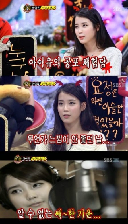 아이유는 지난 20일 방송된 SBS 예능프로그램 ‘강심장-크리스마스 특집’ 편에 출연, 귀신 경험담을 털어놓았다.