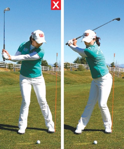 (우) 팔과 손으로만 스윙을 하면 임팩트 후 클럽 헤드가 몸을 따라 안쪽으로 회전하게 된다. 깎아 치는 스윙이 만들어져 슬라이스나 토핑 같은 미스샷으로 연결된다.