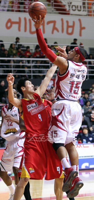23일 고양실내체육관에서 열린 2011-2012 프로농구 고양 오리온스와 창원 LG의 경기에서 LG 문태영이 오리온스 최진수의 수비를 피해 슛을 시도하고 있다.