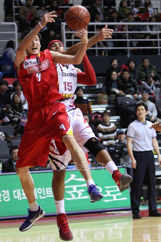23일 고양실내체육관에서 열린 2011-2012 프로농구 고양 오리온스와 창원 LG의 경기에서 오리온스 최진수와 LG 문태영이 리바운드볼을 다투고 있다.