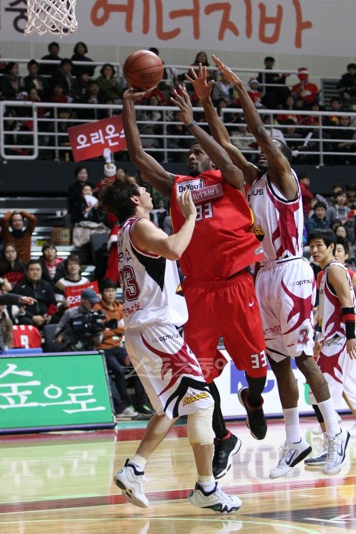 23일 고양실내체육관에서 열린 2011-2012 프로농구 고양 오리온스와 창원 LG의 경기에서 오리온스 윌리엄스가 LG 백인선과 헤인즈의 수비를 피해 슛을 시도하고 있다.