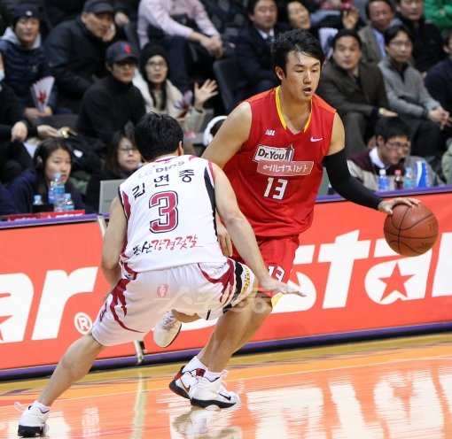 23일 고양실내체육관에서 열린 2011-2012 프로농구 고양 오리온스와 창원 LG의 경기에서 오리온스 김동욱이 상대 김현중의 수비에 맞서 드리블 하고 있다.