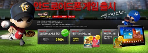 CJ E&M 넷마블은 모비클이 개발한 스마트폰 야구게임 ‘마구마구2012’를 국내 안드로이드 마켓에 출시했다. T스토어와 OZ스토어 등에서도 서비스되고 있다. 아이폰용은 내년 초 공개 예정이다. 출시 가격은 5000원. 단 크리스마스 당일인 25일까지 내려 받는 이용자들은 42% 할인된 2900원에 게임을 즐길 수 있다.