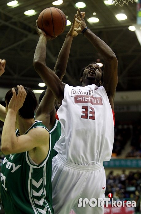 4쿼터 오리온스 윌리엄스가 동부 벤슨의 수비를 뚫고 슛을 던지고 있다.