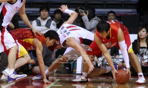 27일 오후 고양체육관에서 열린 2011 ~ 2012 프로농구 고양오리온스와 안양KGC의 경기에서 KGC 양희종이 오리온스 김동욱과 루즈볼을 다투고 있다.