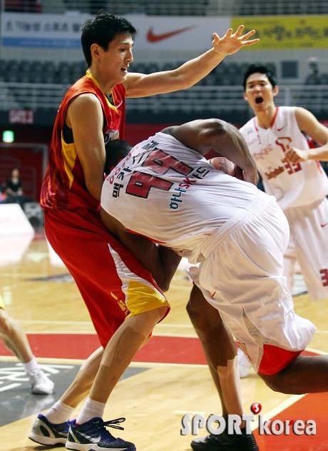 `2011-2012 KB 국민카드 프로농구` 고양 오리온스와 서울 SK 나이츠의 경기가 29일 오후 고양 실내체육관에서 열렸다. 3쿼터 오리온스 최진수가 SK 맥카스킬의 드리블 돌파를 막고 있다.