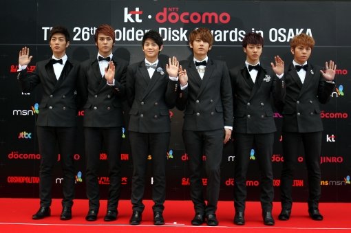아이돌그룹 비스트가 11일 일본 오사카 교세라돔에서 열리는 ‘제26회 골든디스크상’ 시상식에 참석하기 위해 레드카펫에 올라 취재진을 향해 포즈를 취하고 있다.
