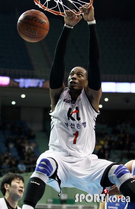 12일 서울 잠실실내체육관에서 열린 `2011-2012 KB 국민카드 프로농구` 서울 삼성 썬더스와 부산 KT 소닉붐의 경기 3쿼터에서 KT 로드가 슬램덩크를 터뜨리고 있다.