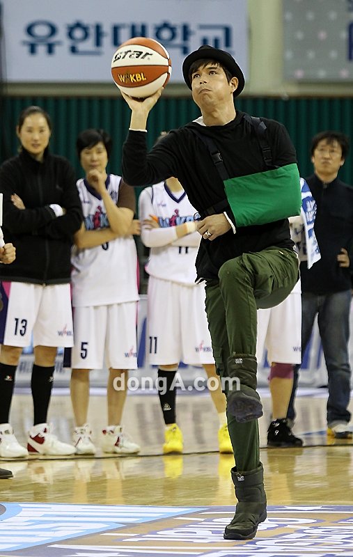 WKBL 레전드 대 연예인 농구단 레인보우의 경기에서 레인보우 리키김이 사랑의 기금 조성 하프라인 슛을 하고 있다.