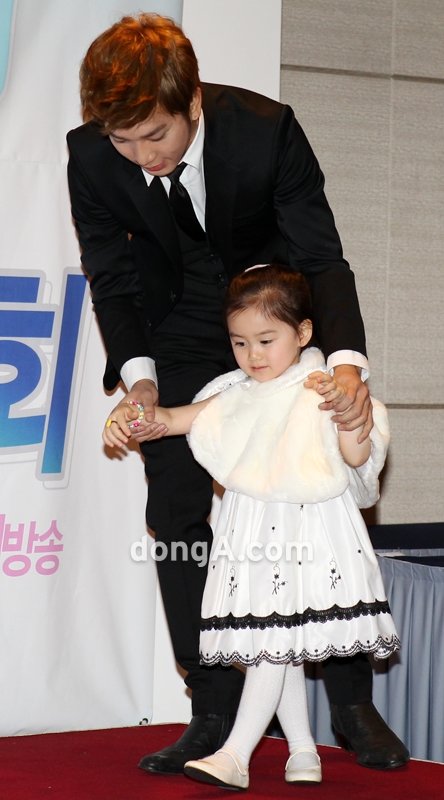 5인조 아이돌 그룹 엠블랙 멤버 지오가 16일 서울 강남구 노보텔앰배서더 강남에서 열린 KBS joy ‘헬로 베이비 시즌 5’ 제작발표회에서 베트남 다문화 가정 아동 윤다영을 돌보며 무대로 입장하고 있다.