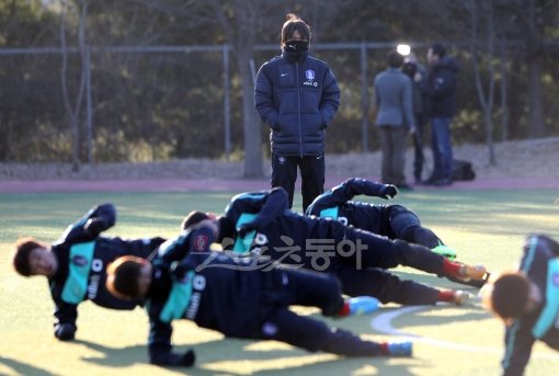 추위 때문에 완전 무장을 한 올림픽팀 홍명보 감독(맨 뒤)이 25일 선수들의 훈련 모습을 진지한 표정으로 바라보고 있다. 올림픽팀은 2월6일 사우디아라비아와 런던올림픽 최종예선 A조 4차전을 앞두고 있다. 파주 | 김종원 기자 won@donga.com 트위터 @beanjjun