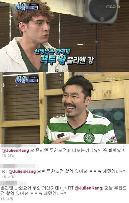 하지만 줄리엔 강이 26일 자신의 트위터에 “오늘 ‘무한도전’ 촬영 있어요”라는 글을 게재했다. 이에 해당 장면은 하하와 노홍철의 대결 후 추가 촬영된 것이 아니냐는 누리꾼들의 의혹이 제기된 것.