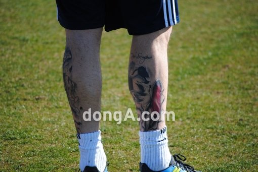 밴쿠버 화이트캡스 FC의 에릭 힌슬리가 3일(한국시간) 미국 애리조나에서 열린 전지훈련 중 몸의 문신을 드러내고 있다.