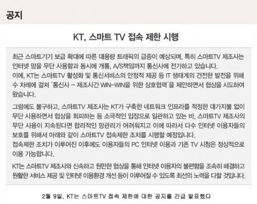 이런 표면적인 사정만 본다면 KT의 이번 조치가 이해될 수도 있다. 하지만 순진하게 이를 동의하기에는 입맛이 쓴 것도 사실이다. 왜냐하면 KT는 이번 조치를 취하면서 ‘스마트TV 제조사들이 정당한 대가 없이 인터넷 망을 무단 사용’하는 것 때문이라는 이유를 달았기 때문이다. 쉽게 말하면 삼성전자나 LG전자와 같은 스마트TV 제조사들이 제품을 판매하려면 KT를 비롯한 인터넷 망 사업자들에게 돈을 내야 한다는 것이다.