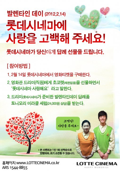 14일 롯데시네마에서 영화티켓을 구매한 후 영화관 직원(또는 드리미)에게 “롯데시네마 사랑해요”라고 말하며 초코렛을 선물하면, 답례품으로 ‘토니모리 미라클 세럼’ 화장품을 증정한다.