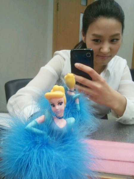 사진 속 장신영은 흰 블라우스 차림으로 거울에 비친 자신의 모습을 스마트폰을 이용해 촬영하고 있다. 장신영은 디즈니 공주 신데렐라 인형을 부러운 듯 시기어린 눈빛으로 바라보고 있다.