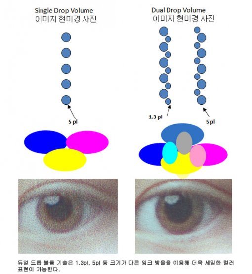 엡손의 다중잉크방울분사(Variable Sized Droplet)기술도 이와 비슷하다. 단색의 컬러에는 큰 잉크방울을, 혼합 컬러에는 미세한 잉크방울을 분사해 품질뿐 아니라 출력속도까지 높인다.
