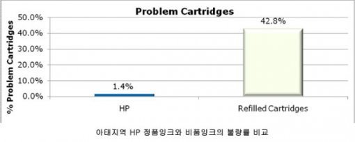 이는 독일의 테스트 기관 티유브이슈드 PSB가 2007년 조사한 품질테스트에서 잘 드러난다. 이에 따르면 아시아 태평양 지역에 판매된 HP 정품잉크의 경우 불량률이 1.4%에 불과했지만, 호환잉크의 경우 평균 42.8%가 초기불량이거나 조기에 성능이 저하되는 것으로 나타났다. 같은 지역에 판매된 캐논의 호환잉크 역시 불량률이 56.5%에 달했다. 호환잉크 2개 중 1개는 제값을 못했다는 이야기다. 여기에 불량품을 교환하는데 소모하는 시간을 감안하면 호환잉크의 효율은 더 떨어질 수밖에 없다.