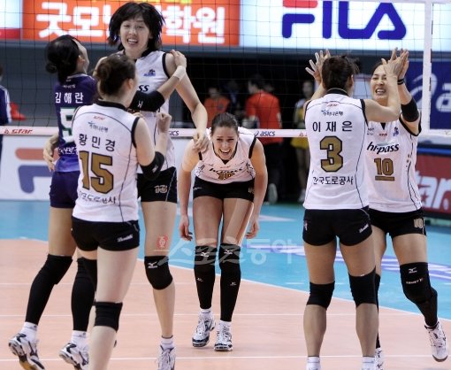 도로공사 선수들이 21일 열린 인삼공사와 경기에서 풀세트 접전 끝에 역전승 한 뒤 기뻐하고 있다. 대전 | 박화용 기자 inphoto@donga.com 트위터@seven7sola