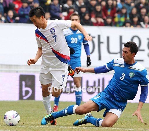 25일 오후 전주월드컵경기장에서 열린 대한민국 대 우즈베키스탄의 경기에서 후반전 대한민국 김두현이 상대 수비수의 발에 걸려 넘어지고 있다.
