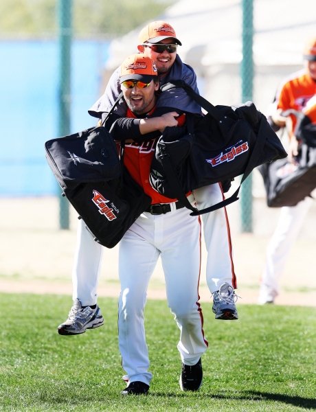 올해로 프로 3년차인 한화 안승민(뒤). 빼어난 제구력을 갖춘 그는 최근 2년간의 경험을 바탕삼아 올시즌 한 단계 더 성장한 모습을 보일 것으로 기대된다. 안승민이 애리조나 전지훈련 때 공주고 선배이자 룸메이트인 박찬호의 등에 업혀 환한 미소를 짓고 있다. 사진제공|한화 이글스