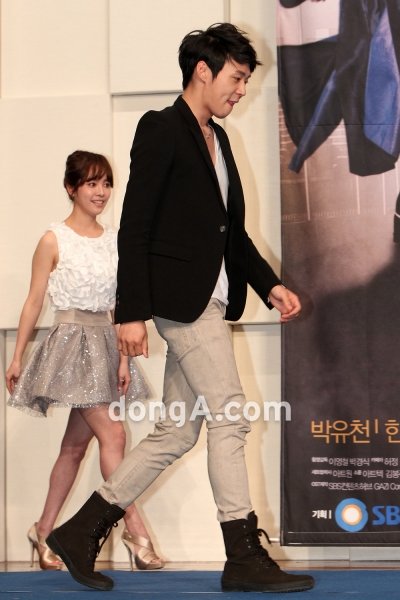 연기자 박유천이 5일 오후 서울 송파구 잠실롯데호텔 그랜드볼룸에서 진행된 SBS 새 수목드라마 ‘옥탑방 왕세자’의 제작발표회에서 한지민과 커플 포토타임을 갖기 위해 자리를 잡고 있다.