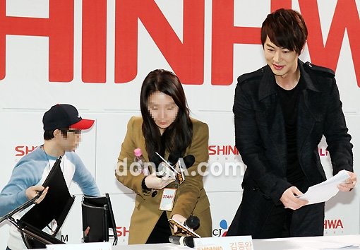 그룹 신화 멤버 전진이 5일 오후 서울 강남구 CGV 청담씨네시티에서 열린 ‘14주년 기념 컴백 기자회견’에서 관계자들과 물품 뒷정리를 하고 있다.