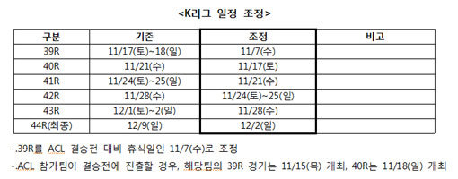 11월 17~18일 예정이던 39라운드는 AFC 챔피언스리그 결승전 대비 휴식일(11/7)로 옮기고, 40라운드부터 마지막 44라운드까지 순차적으로 일정을 앞당겼다. 이와 함께 K리그 팀이 AFC 챔피언스리그 결승에 진출할 경우를 대비해 결승 진출팀의 39라운드 경기는 11월 15일에, 40라운드는 11월 18일에 개최하기로 정했다.