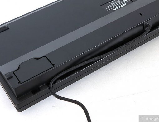 키감에 대해서는 차후 설명하고 우선 전반적인 외형에 대해 훑어 본다. 기계식 키보드라 해서 일반적인 (멤브레인) 키보드와 별반 다를 건 없다. 온통 검은색에 우측 상단의 빨간색 ‘ABSOLUTE’ 로고만 눈에 띈다. 키 개수는 총 106개라 있어야 할 키는 다 있다. 바닥에는 높이를 조절하는 받침대가 있다. 다른 키보드보다 받침대 너비가 넓어 타이핑 시 안정적으로 지지할 수 있을 것으로 판단된다. 아울러 케이블이 본체 중앙에 달려 있어 책상 배치에 따라 왼쪽 또는 오른쪽으로 돌려 (케이블 홈에) 고정할 수 있도록 했다.